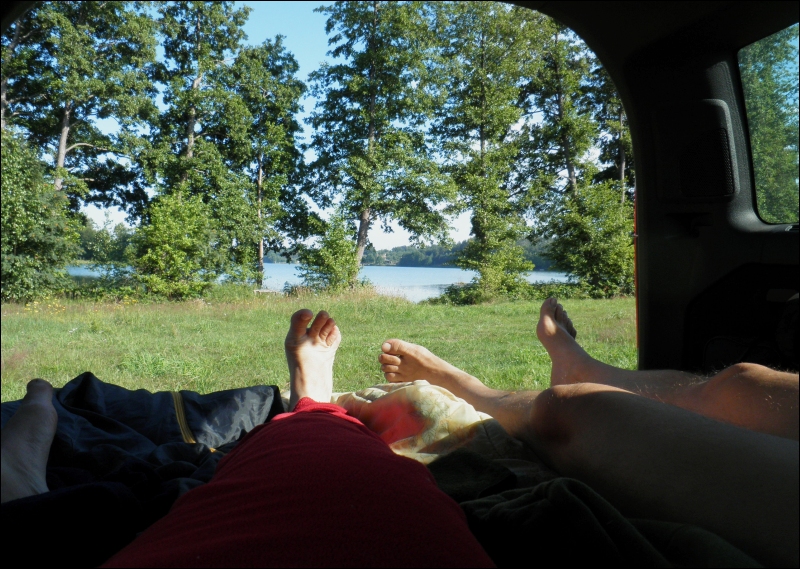 Biwakowo-namiotowe wakacje to dla nas co prawda żadna nowość, przecież co roku tak spędzamy urlop na Kaszubach. Tyle, że bez przemieszczania się z całym dobytkiem, na dodatek garkuchnia (łącznie ze stolikiem, czajnikiem, miskami, talerzami, garnkami, kubkami, itp. itd.) od lat zimuje w stodole gospodarzy "naszej" łąki, więc auto zapomniało, że takie rzeczy wozi się ze sobą